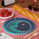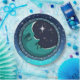 Blue crescent moon with the face of a sleeping man in a starry night sky. Part of his face is lit up by a bight white shining star. The design is set inside a blue circle border with small white and blue dots.