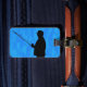 Stylish design of a silhouette of a man fishing with his fishing rod against a background of abstract blue art resembling the ocean or the sky. A perfect gift or design for a guy who enjoys fishing as a sport or hobby.