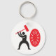 This design is a man hitting a gong. The man has a big red mallet that he is swinging into the red gong. This man hitting a gong design looks great on this Keychain