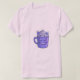 A man with dark hair and a beard is shown from the waist up, wearing a plain white t-shirt and blue jeans. He is looking to his right with a slight smile. Centred on his t-shirt is a graphic of a purple mug designed with a spooky, carved-face expression, topped with a large dollop of white whipped cream and two small purple horns or ears, along with a few candy corn decorations. The background is a solid, light colour.