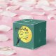 This party favour or gift box is deep emerald green with white glowing stars and a man climbing a ladder to a yellow moon with a face who is winking with the text Reaching for the Moon. Customise your own text on the top flap with the template.