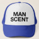 MAN SCENT fun slogan on trucker hat, black type on royal blue hat - just like in the series episode, bold typography, fun statement, inspired by tv character frank rossitano.