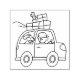 A moving cartoon car with a big-nosed driver in a baseball hat, a happy dog in the back seat, and a bunch of boxes and a cactus on its roof.