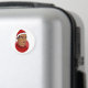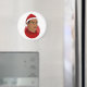 Round magnet with illustration of a African American or Hispanic man with short black hair and red Santa Claus hat; in red circle on red background, with customisable text template for your name or message