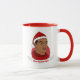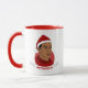 Christmas mug with illustration of a African American or Hispanic man with short black hair and red Santa Claus hat; in red circle on a white background, with customisable text template for your name or message