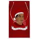 Gift bag with illustration of a African American or Hispanic man with short black hair and red Santa Claus hat; in red circle on a red background, with customisable text template for your name or message