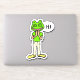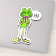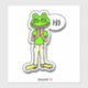 This cheerful computer-generated digital art graphic shows a man with a smiling frog head saying hi. The art is in cartoon sticker style. This funny, happy frog man was created using an image generation of the AI source DALL-E, and is sure to be fun for fans of technology, new art, and frogs!