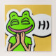 This cheerful computer-generated digital art graphic shows a man with a smiling frog head saying hi. The art is in cartoon sticker style and is on bright yellow. This funny, happy frog man was created using an image generation of the AI source DALL-E, and is sure to be fun for fans of technology, new art, and frogs!