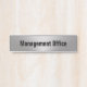 This modern office door sign has a brushed metal look. (The silver look is artwork, not foil.) There's also black display text that you can edit to show a business name or a custom message. (Shown: Management Office)