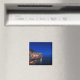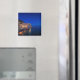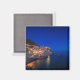 Souvenir photo magnet with the small town Manarola, 1 of the famous five Cinque Terre hill towns, built upon a cliff overlooking the Mediterranean Sea, with the lights on during Blue Hour in the beginning of the night in Liguria, Italy.