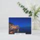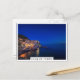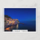 Postcard of the small town Manarola, 1 of the famous five Cinque Terre hill towns, built upon a cliff overlooking the Mediterranean Sea, with the lights on during Blue Hour in the beginning of the night in Liguria, Italy with a white edge and in black the text 'Cinque Terre'.