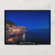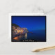 Postcard of the small town Manarola, 1 of the famous five Cinque Terre hill towns, built upon a cliff overlooking the Mediterranean Sea, with the lights on during Blue Hour in the beginning of the night in Liguria, Italy with a black edge and in white the text 'Manarola'.