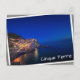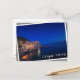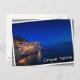 Postcard of the small town Manarola, 1 of the famous five Cinque Terre hill towns, built upon a cliff overlooking the Mediterranean Sea, with the lights on during Blue Hour in the beginning of the night in Liguria, Italy with a white edge and the text 'Cinque Terre'.