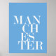 This minimalist typographic artwork proudly showcases the bustling city of Manchester, UK. Featuring crisp white text against a striking light blue background, this piece perfectly captures the vibrant energy of this iconic city. Known for its rich musical heritage, home to legendary bands like Oasis and The Stone Roses, and the passionate Manchester City football club, this artwork encapsulates the spirit of Manchester.