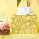 Wrapping paper in an ornate, geometric flower pattern in shades of deep mustard gold with deep and pastel yellow