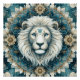 This is a stunning piece of artwork that showcases a stylised lion's face at its centre. The lion's mane forms a mandala-like design, with flowing white and grey lines creating a sense of motion and texture. Surrounding the face are intricate patterns that layer outward, including floral and geometric shapes in shades of blue, teal, and beige. These elements contribute to a sense of depth and symmetry.