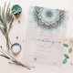 A lacy mandala pattern in a gradient of soft robin's egg blue and warm grey along with flowing script text give this elegant wedding suite it's luxurious appeal. The transparent acrylic wedding invitation shown here allows you to easily edit the details of your event using the provided template. Search ID968 to see all the matching pieces in this beautiful wedding set.