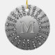 Ornament in a mandala pattern in a satin gradient of overlapping discs centring around a spoked wheel of stars - shades of light silver grey / grey to graphite grey, with a personalised monogram