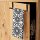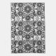 Kitchen towel in a twelve point mandala pattern in shades of graphite and silver grey, accented with black and white