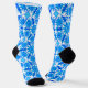 Socks in a twelve point mandala pattern in shades of cobalt and cerulean blue with turquoise and aqua, accented with white