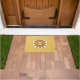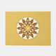 Doormat in a twelve point mandala pattern in shades of chocolate brown, mustard gold, and dark brown on white, with a gold background