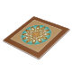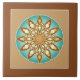 Ceramic tile in a twelve point mandala pattern in shades of light chocolate, tan and cream with a shaded turquoise background, framed in tan and chocolate