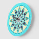 Twelve point mandala pattern in shades of turquoise, tan, navy, beige and grey on a turquoise background