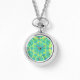 Twelve point mandala pattern in turquoise, blue, and shades of lime green accented with royal blue