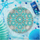 Twelve point mandala pattern in turquoise, blue, white, and shades of grey / grey on a pale, silver grey background
