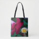 Mandevilla and Daisy Tote Bag features a red Mandevilla and a small yellow daisy next to each other. The Mandevilla gives the appearance of being a gramophone playing music to the yellow daisy. Perfect as a beach bag, groceries, and everyday use.