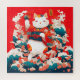 Behind the Maneki-Neko, a mesmerising wave of tranquil blue-green sweeps across the canvas, embodying the essence of Japanese artistry. The wave, reminiscent of traditional ukiyo-e prints, provides a dynamic contrast to the vivid red hues, creating a harmonious blend of old and new.