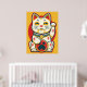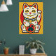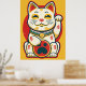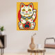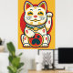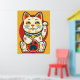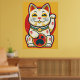 This vibrant illustration features a traditional Japanese Maneki Neko, or "Lucky Cat," depicted in a charming and whimsical style. The cat is shown sitting upright, raising its left paw in a welcoming gesture believed to bring good fortune and happiness. The cat has a delightful and cheerful expression, with its eyes wide and mouth curved into a gentle smile.