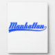 Manhattan, New York City, written with a swash (tail). Fonts in white and blue. Original text design.