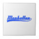 Manhattan, New York City, written with a swash (tail). Fonts in white and blue. Original text design.