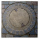 Features an antique manhole cover grate nestled in an old cobblestone road. Rustic and refined with old world charm.