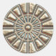 Rusty industrial metal reflects in this manhole cover inspired three dimensional geometric pattern in rich shades of gold, sliver and stainless steel. Available on a wide range of gift and stationery products.