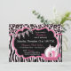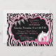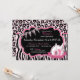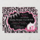 Chic and wild spa party birthday invitation card design with cheetah and zebra animal prints, bunting banner, and nail polish. Colours are pinks, black and white.