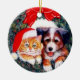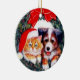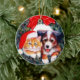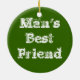 A cat with a stocking and a dog are centred in a green wreath on this ornament and on the other side are the words: Man's Best Friend on a green background.