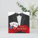 Tuxedo poker chips and playing cards Las Vegas poker party invitation. This red and black poker party invitation is easily customised for your event by simply adding your event details, font style, font size & colour, and wording.