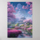 The digital art piece "Mansion in a Garden of Flowers Poster" showcases a serene and tranquil scene of a stunning Japanese mansion nestled in the heart of a vibrant garden. The light blue walls of the mansion blend seamlessly with the soft blue sky, creating a sense of harmony and balance. The garden is adorned with a myriad of colourful flowers, including delicate cherry blossoms, and a gentle river runs through it, adding to the peaceful ambiance. Beyond the garden, a small green forest stands, its leaves rustling gently in the breeze, and the sky above it is cloudy and contemplative.