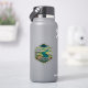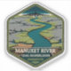 A hexagonal vintage travel badge inspired by the Manuxet River and its tidal marshlands near Innsmouth, depicting a calm aerial view of coastal wetlands leading toward the sea.