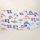 This beach towel design features a pattern involving various music notes and music notation symbols coloured a variety of colours. [~Z0000001]