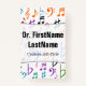 This badge design features a pattern involving various music notes and music notation symbols coloured a variety of colours. It also features a personalised name in black coloured text within a light coloured area. There is also a customisable message under the name that could show information such as a job title, or a profession, or a business/company name. [~Z0000176]