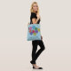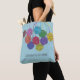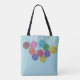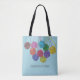 Use this tote to hold your yarn project. It is decorated with a drawing of many balls of yarn, each a different colour, on a pale blue background. You can personalise it on the front with your name and words. This sample reads "Carolyn's Crochet", but you could change it to "Knitting" or "Crafting", for example, with your own name. The drawing is original to LyricalCrafts.