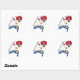 Map of The Netherlands with the red, white and blue horizontal stripes of it's flag within the flag. A few items associated with the country decorate the map including a line of tulips, a round of cheese, and wooden shoes.