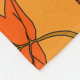 stylised illustration of a Maple leaf, chraacterised by its vibrant orange colour. The leaf is depicted with a distinct outline and exhibits a classic maple leaf shape, with multiple pointed lobes and jagged edges. The veins of the leaf are outlined and noticeable, adding texture to the design. A short, brown stem connects the leaf to what appears to be its branch, completing the illustration with a simple yet eye-catching aesthetic. The overall design has a flat, graphic quality, emphasizing the bold colour and shape of the leaf.