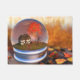 Inside a "snow globe" is an autumn landscape with a cottage overshadowed by maple and cherry trees. The surrounding field is filled with tall green and golden grass. Roses and ivy climb the wall of the little house. The maple tree is in brilliant fall colour, and instead of snow there are maples leaves in shades of red, orange, and yellow swirling around in the globe and blanketing the grass.