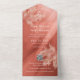 This autumnal wedding all-in-one invitation has a terracotta colour theme featuring subtle monochromatic maple leaves accenting a blush to terracotta gradient background - by katz_d_zynes