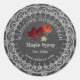 Customisable homemade maple syrup bottle canning labels, featuring autumnal fall maple leaves set on a black chalkboard background, for that farmhouse vibe. Bordered by a white lace doily for a stylish country look.