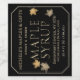 This maple syrup label can be customised with your business name, address and maple syrup volume in ounces and milliliters. There is a handy list of common container sizes with their conversions in the form field where you fill in your information. Black background with gold text and border. For a special touch, the word “maple syrup” has a gold gradient. Four dainty gold and yellowish-orange leaves are scattered on the black background as though they were falling from a sugar maple in autumn.